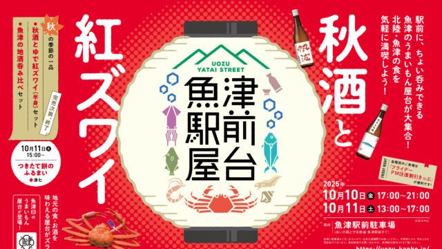 魚津駅前屋台イベント「秋酒と紅ズワイ」 富山県内で紅ズワイガニの水揚げ量No.1を誇る魚津市。その魚津の駅前に、地元の人気店が集う屋台イベントが登場します! 今回のテーマは「秋酒と紅ズワイ」。富山湾の深海から水揚げさ … 続きを読む (終了)魚津駅前屋台「秋酒と紅ズワイ」初開催/10月10日〜10月11日