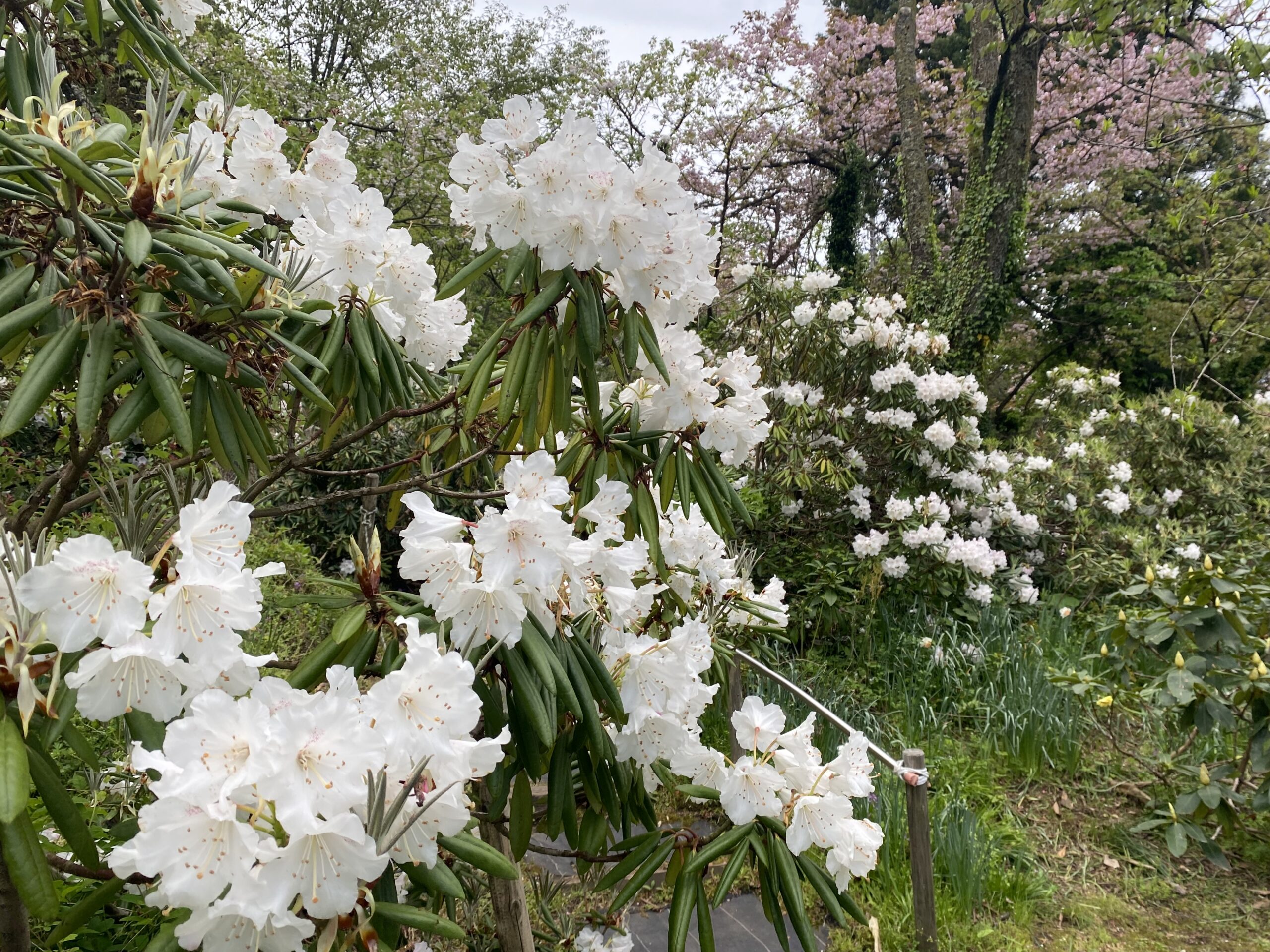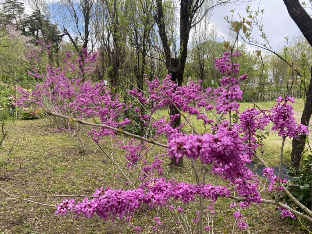 白いポッコリしたヤマシャクヤクはとても可愛く、赤紫の綺麗な色を放っているハナズオウも鮮やかな色をまとっています。