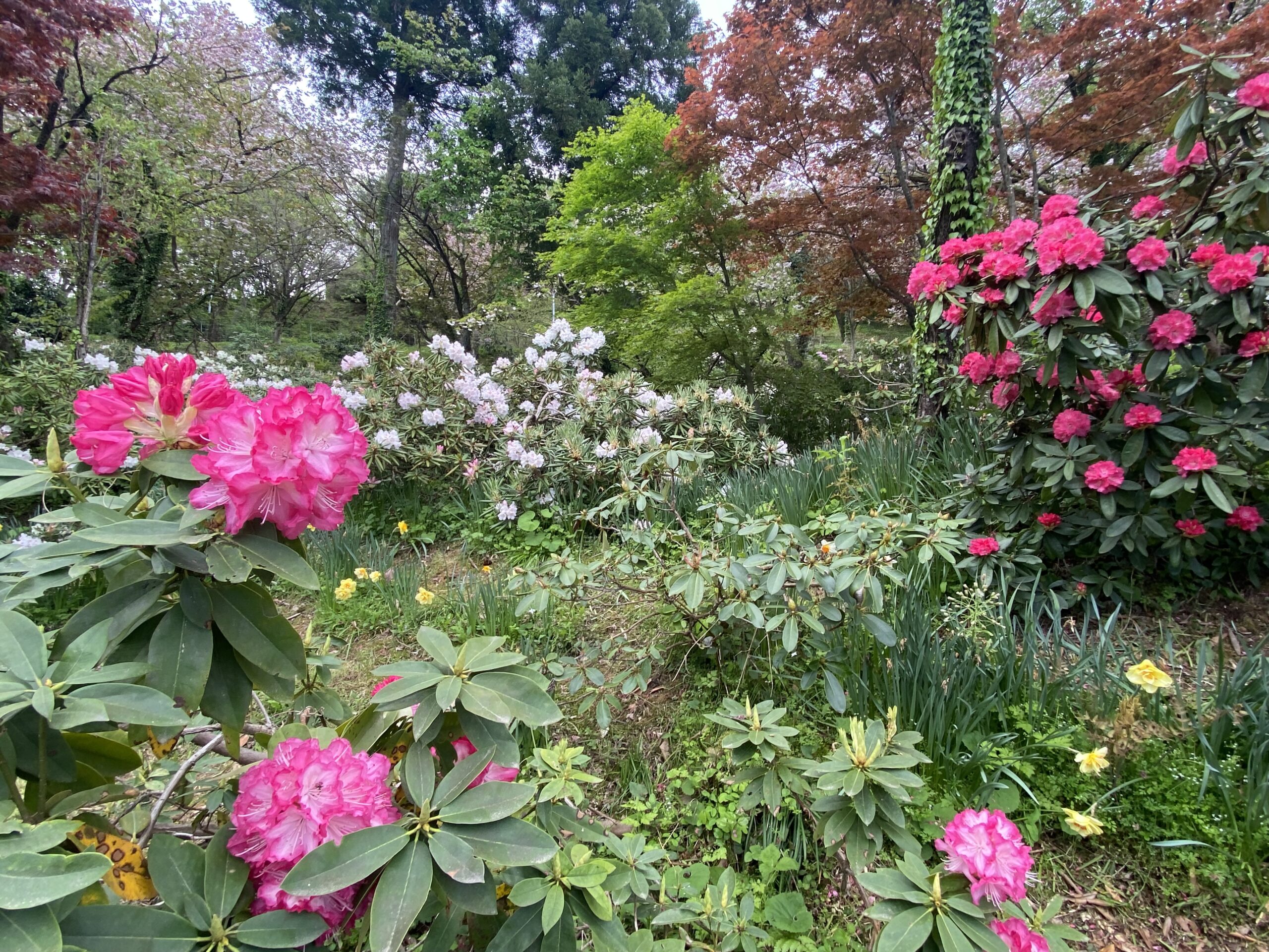 ガーデンには、まだまだきれいな花が咲き誇っています。特に、中央にある大きな八重桜の存在感は圧巻です。