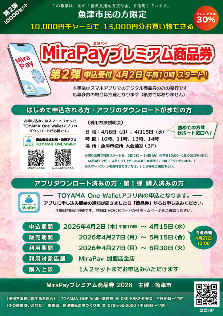 【魚津市民の方限定】MiraPayプレミアム商品券 第2弾販売決定!/応募締め切りは4月15日まで