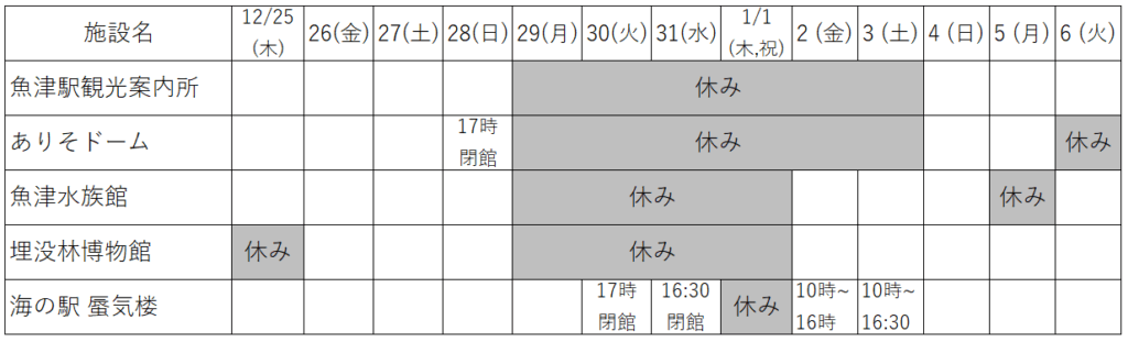 魚津市内の下記施設では、下記の期間を休業とさせて頂きます。