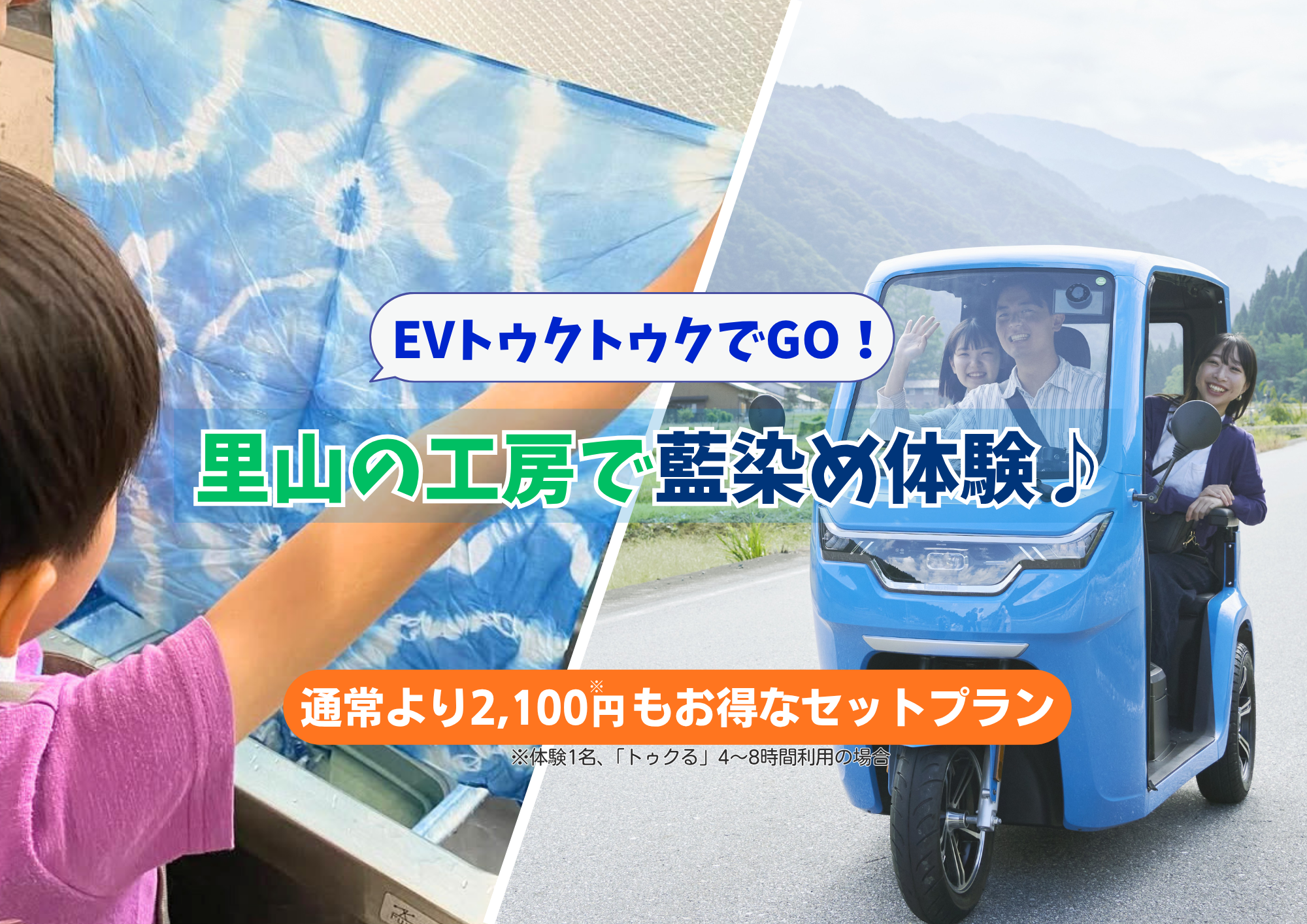 トゥクトゥクで楽しみながら、世界に一つだけの美しい「里山ブルー」を体験。